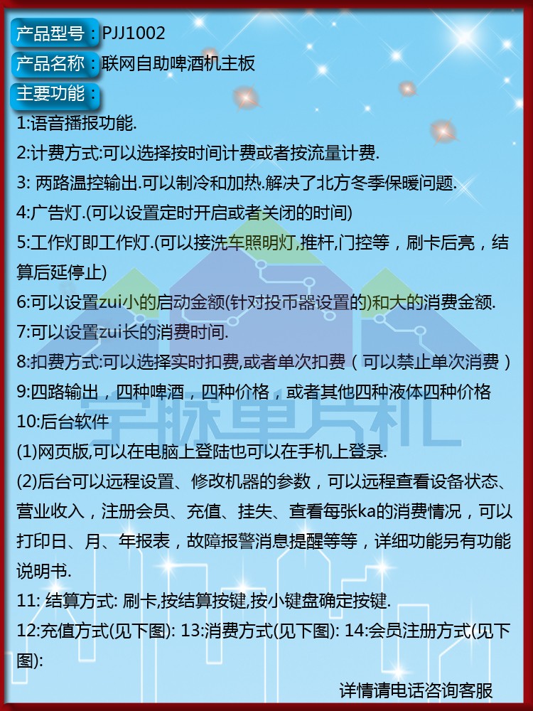 广州宇脉电子MCU单片机开发厂家,自主研发自助啤酒售卖机主板,支持联网支付功能:微信、支付宝、扫码支付功能刷卡,注册会员可以直接输入手机号加密码,更加方便用户,不用带卡就能启动设备消费,减少成本。主控板多功能,可以远程查看设备状态,明细报表等功能。欢迎来电了解 18520500709/400-1898-020