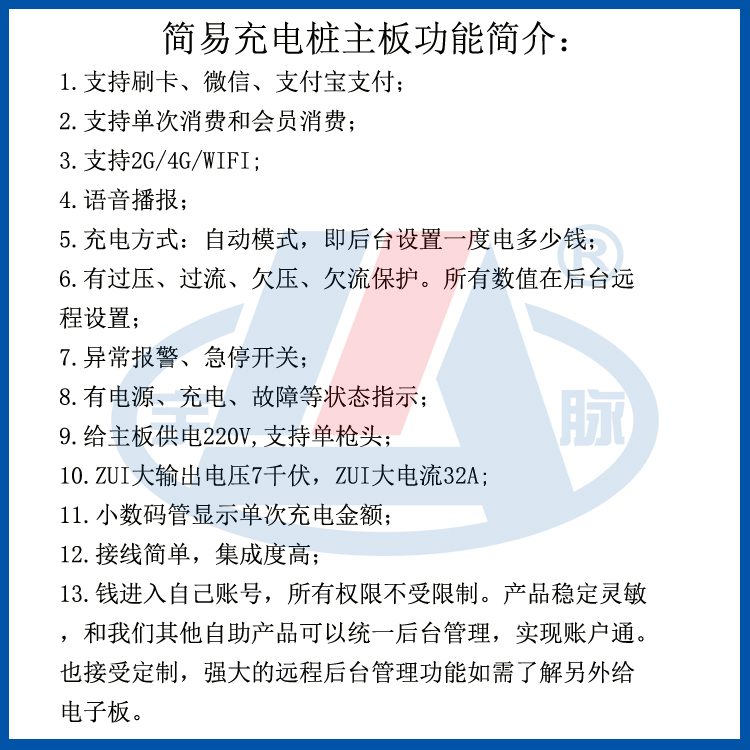 宇脉新品研发——自助充电桩主板,1020-05型,单次消费、会员消费、微信、刷卡、支付宝支付多功能,自主选择,自由设置参数,权限自由,主控设备自助研发生产,多功能自助设备,支持定制开发,主控设备不定期的升级,享受厂家免费升级功能,宇脉自助设备支持一卡通,统一后台管理。